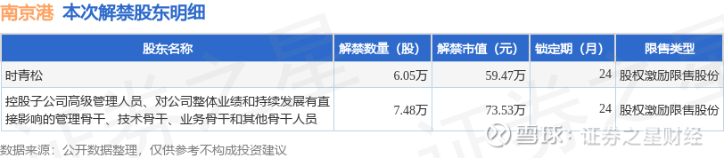 证券之星消息,根据市场公开信息整理,南京港(002040)于12月22日将有13.53万股限售股份解禁,为公司股权激励限售股份,占公司总股本0.03%。(本次数据根据历史公告整理得出,实际情况以上市公司最新公告为准)最近一年内,该股累计解禁197.33万股,占总股本的0.4%。本次解禁后,公司还有187.15万股限售股份,占总股本0.38%。具体如下图所示: