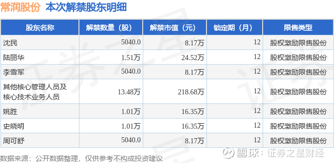 证券之星消息,根据市场公开信息整理,常润股份(603201)于12月22日将有18.52万股限售股份解禁,为公司股权激励限售股份,占公司总股本0.1%。(本次数据根据历史公告整理得出,实际情况以上市公司最新公告为准)最近一年内,该股累计解禁1.1亿股,占总股本的58.14%。本次解禁后,公司还有162.5万股限售股份,占总股本0.86%。具体如下图所示: