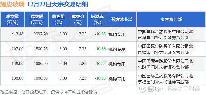 证券之星消息,12月22日耀皮玻璃发生大宗交易,交易数据如下: