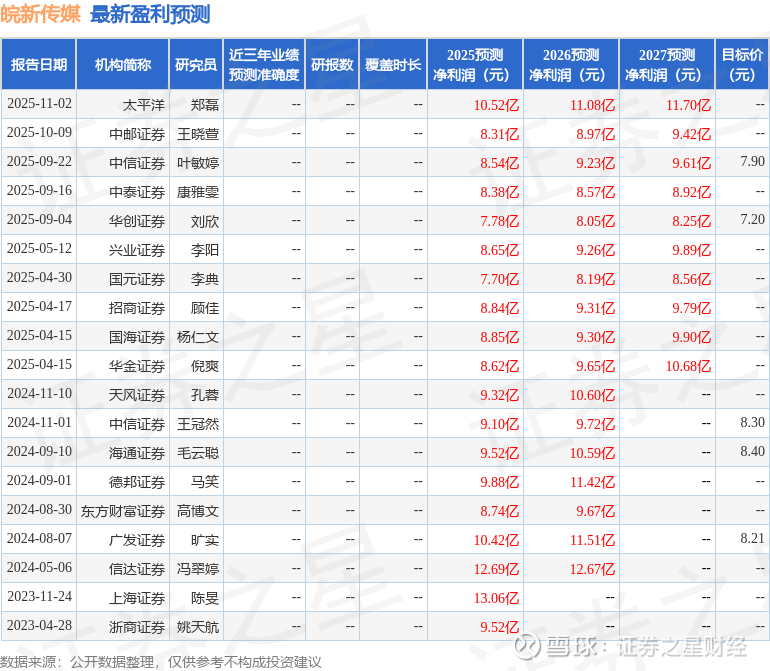 最新盈利预测明细如下: