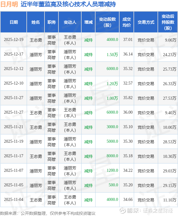 日月明近半年内的董监高及核心技术人员增减持详情如下: