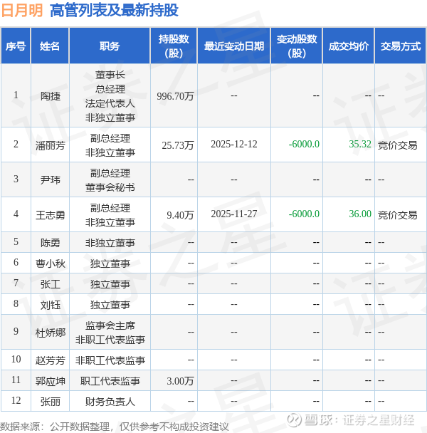 日月明的高管列表及最新持股情况如下: