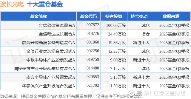 根据2025基金Q3季报公募基金重仓股数据,重仓该股的公募基金共8家,其中持有数量最多的公募基金为金信基金的金信稳健策略混合A。金信稳健策略混合A目前规模为14.92亿元,最新净值2.3239(12月22日),较上一交易日上涨3.31%,近一年上涨53.57%。该公募基金现任基金经理为孔学兵。孔学兵在任的基金产品包括:金信行业优选混合发起式A,管理时间为2020年9月29日至今,期间收益率为84.88%;金信精选成长混合A,管理时间为2023年9月14日至今,期间收益率为64.0%。