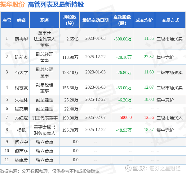 振华股份近半年内的董监高及核心技术人员增减持详情如下: