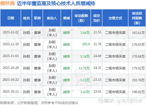 德林海近半年内的董监高及核心技术人员增减持详情如下: