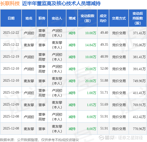 长联科技近半年内的董监高及核心技术人员增减持详情如下: