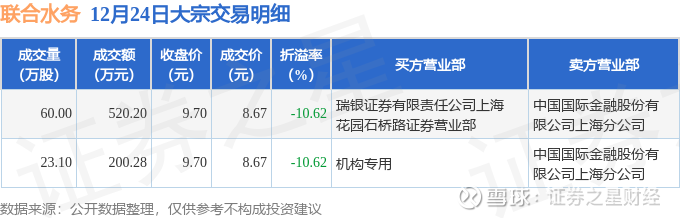 证券之星消息,12月24日联合水务发生大宗交易,交易数据如下: