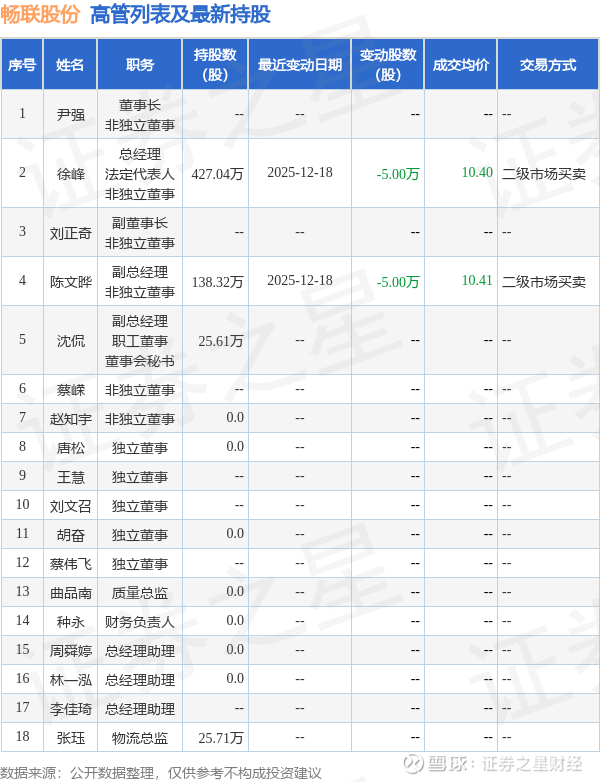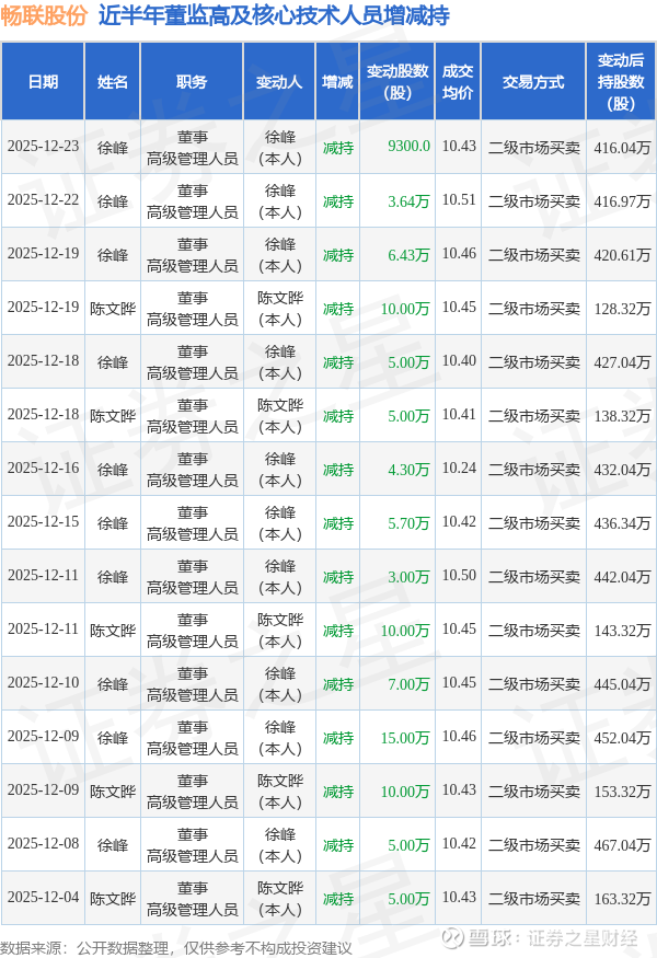 畅联股份近半年内的董监高及核心技术人员增减持详情如下: