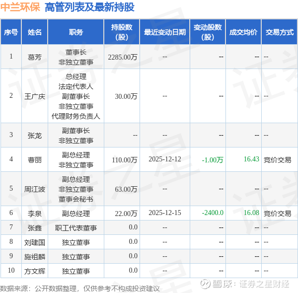 中兰环保近半年内的董监高及核心技术人员增减持详情如下: