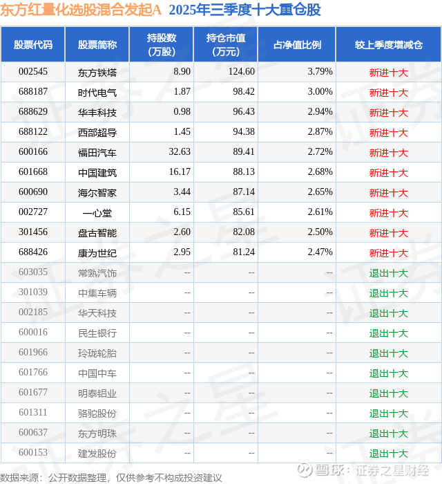 根据2025基金Q3季报公募基金重仓股数据,重仓该股的公募基金共1家,其中持有数量最多的公募基金为东方红资产管理的东方红量化选股混合发起A。东方红量化选股混合发起A目前规模为0.24亿元,最新净值1.2061(12月24日),较上一交易日上涨0.9%,近一年上涨14.32%。该公募基金现任基金经理为徐习佳。徐习佳在任的基金产品包括:东方红中证竞争力指数A,管理时间为2019年7月31日至今,期间收益率为56.62%;东方红中证优势成长指数发起A,管理时间为2023年9月19日至今,期间收益率为49.14%;东方红中证500指数增强发起A,管理时间为2024年7月9日至今,期间收益率为32.02%。