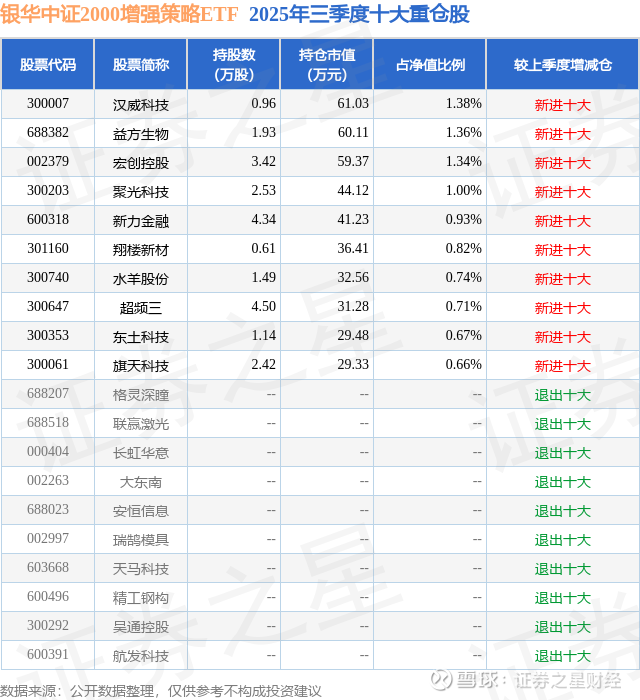 根据2025基金Q3季报公募基金重仓股数据,重仓该股的公募基金共1家,其中持有数量最多的公募基金为银华基金的银华中证2000增强策略ETF。银华中证2000增强策略ETF目前规模为0.44亿元,最新净值1.6316(12月24日),较上一交易日上涨1.35%,近一年上涨44.8%。该公募基金现任基金经理为张凯 张亦驰。张凯在任的基金产品包括:银华大数据灵活配置定开混合,管理时间为2016年4月7日至今,期间收益率为-3.0%;银华沪深300指数A,管理时间为2018年3月7日至今,期间收益率为43.47%;银华深证100指数(LOF),管理时间为2019年8月29日至今,期间收益率为39.89%;银华新能源新材料A,管理时间为2021年9月28日至今,期间收益率为-19.42%。张亦驰在任的基金产品包括:银华华证ESG领先指数,管理时间为2021年11月23日至今,期间收益率为10.54%;银华中证农业主题ETF,管理时间为2022年6月20日至今,期间收益率为-13.64%;银华中证影视主题ETF,管理时间为2022年6月20日至今,期间收益率为12.81%;银华中证内地地产主题ETF,管理时间为2022年11月21日至今,期间收益率为-35.56%。