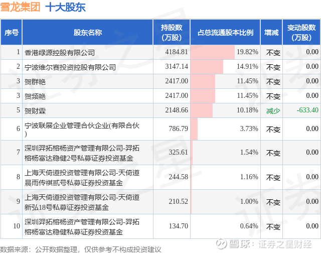 根据雪龙集团2025年三季报公布的十大股东详情如下:
