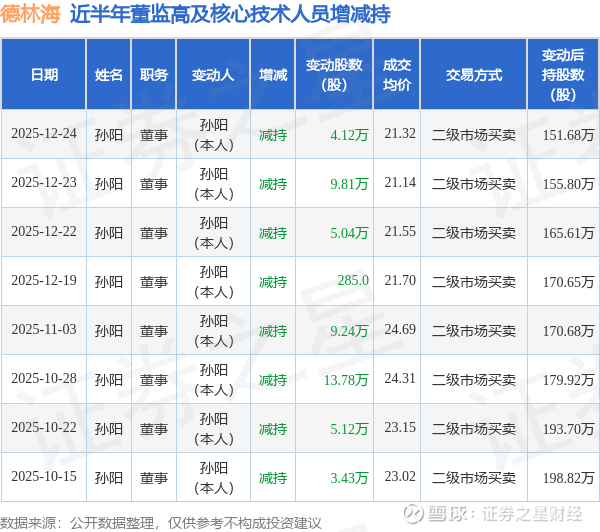 证券之星消息,根据12月25日市场公开信息、上市公司公告及交易所披露数据整理,德林海(688069)最新董监高及相关人员股份变动情况:2025年12月24日公司董事孙阳共减持公司股份4.12万股,占公司总股本为0.0365%。变动期间公司股价上涨1.18%,12月24日当日收盘报21.4元。