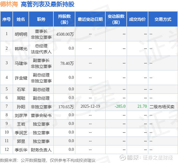 德林海的高管列表及最新持股情况如下: