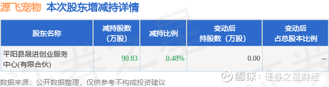 证券之星消息,12月25日源飞宠物发布公告《源飞宠物:关于股东减持计划实施完成暨减持结果公告》,其股东平阳县晟进创业服务中心(有限合伙)于2025年10月24日至2025年12月24日间合计减持90.83万股,占公司目前总股本的0.4758%,变动期间该股股价下跌0.87%,截止12月24日收盘报23.82元。