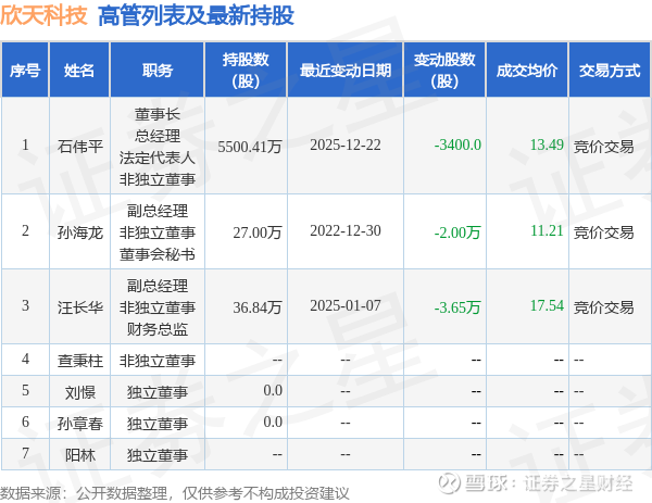 证券之星消息,根据12月25日市场公开信息、上市公司公告及交易所披露数据整理,欣天科技(300615)最新董监高及相关人员股份变动情况:2025年12月24日公司董事,高管石伟平共减持公司股份30.0万股,占公司总股本为0.1553%。变动期间公司股价上涨1.51%,12月24日当日收盘报13.45元。