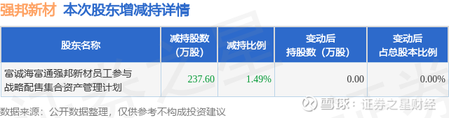 证券之星消息,12月25日强邦新材发布公告《强邦新材:关于减持计划实施进展公告》,其股东富诚海富通强邦新材员工参与战略配售集合资产管理计划于2025年11月18日至2025年12月24日间合计减持237.6万股,占公司目前总股本的1.485%,变动期间该股股价下跌10.4%,截止12月24日收盘报34.21元。