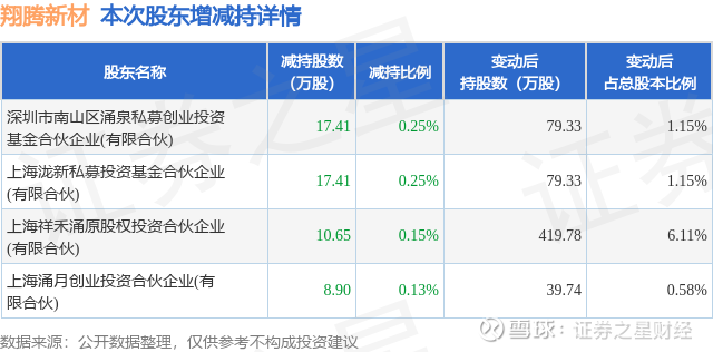 证券之星消息,12月26日翔腾新材发布公告《翔腾新材:关于持股5%以上股东权益变动触及1%整数倍的公告》,其股东深圳市南山区涌泉私募创业投资基金合伙企业(有限合伙)、上海泷新私募投资基金合伙企业(有限合伙)、上海祥禾涌原股权投资合伙企业(有限合伙)、上海涌月创业投资合伙企业(有限合伙)于2025年12月18日至2025年12月25日间合计减持54.36万股,占公司目前总股本的0.7914%,变动期间该股股价上涨10.0%,截止12月25日收盘报31.14元。