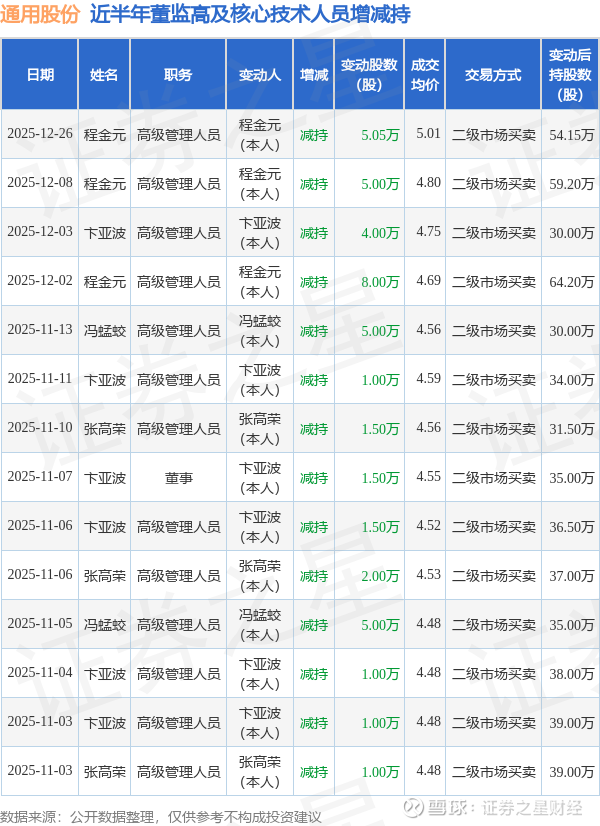 通用股份近半年内的董监高及核心技术人员增减持详情如下: