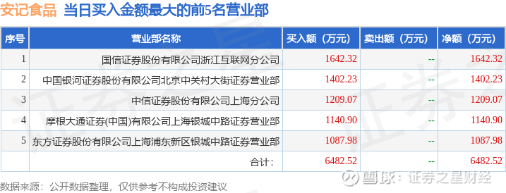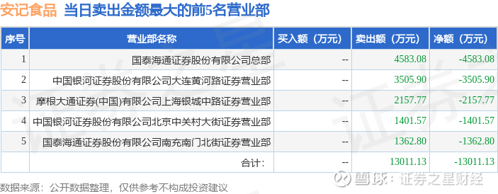 证券之星消息,沪深交易所2025年12月29日公布的交易公开信息显示,安记食品(603696)因有价格涨跌幅限制的日收盘价格跌幅偏离值达到7%的前五只证券登上龙虎榜。此次是近5个交易日内第3次上榜。