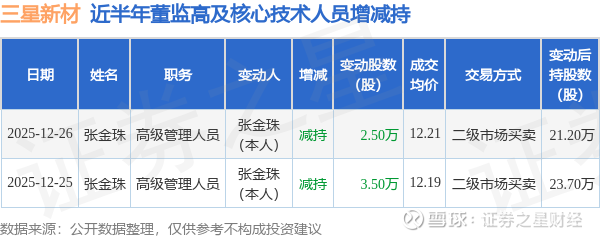 证券之星消息,根据12月29日市场公开信息、上市公司公告及交易所披露数据整理,三星新材(603578)最新董监高及相关人员股份变动情况:2025年12月26日公司高级管理人员张金珠共减持公司股份2.5万股,占公司总股本为0.0139%。变动期间公司股价下跌1.88%,12月26日当日收盘报12.0元。