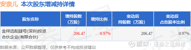 证券之星消息,12月29日安奈儿发布公告《安奈儿:关于控股股东一致行动人增持股份触及1%刻度及后续增持计划的公告》,其股东金祥远舵肆号(深圳)投资合伙企业(有限合伙)于2025年12月26日合计增持206.47万股,占公司目前总股本的0.9693%,变动期间该股股价上涨4.8%,截止12月26日收盘报16.58元。