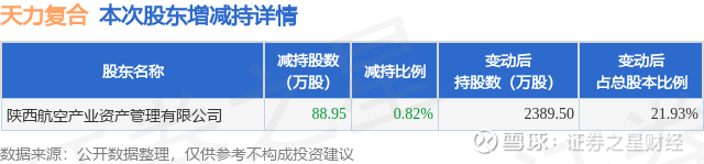 证券之星消息,12月29日天力复合发布公告《天力复合:持股5%以上股东权益变动达到1%的提示性公告》,其股东陕西航空产业资产管理有限公司于2025年12月26日至2025年12月29日间合计减持88.95万股,占公司目前总股本的0.8164%,变动期间该股股价下跌12.58%,截止12月29日收盘报75.89元。