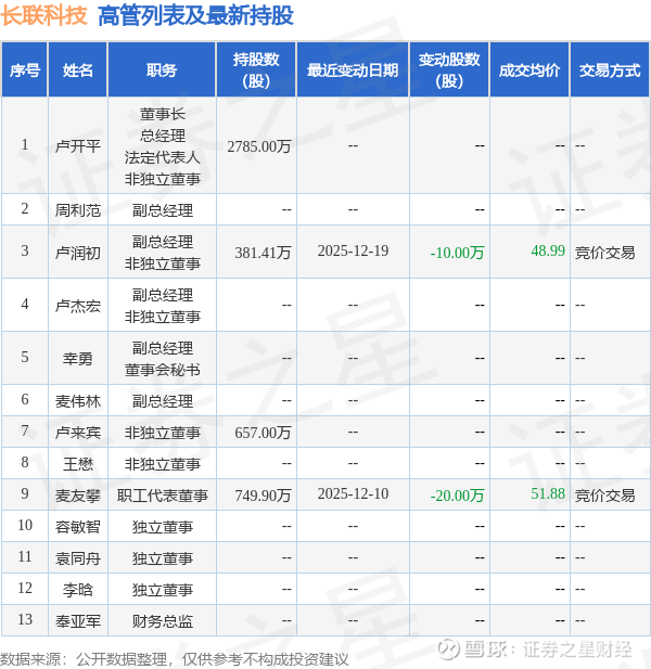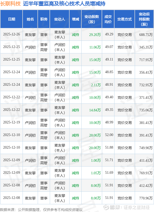 长联科技近半年内的董监高及核心技术人员增减持详情如下: