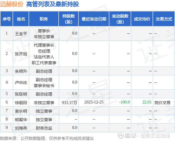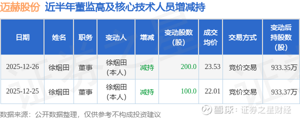 证券之星消息,根据12月29日市场公开信息、上市公司公告及交易所披露数据整理,迈赫股份(301199)最新董监高及相关人员股份变动情况:2025年12月26日公司董事徐烟田共减持公司股份200.0股,占公司总股本为0.0001%。变动期间公司股价下跌1.37%,12月26日当日收盘报23.01元。