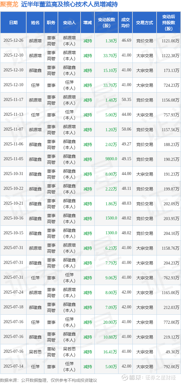 聚赛龙近半年内的董监高及核心技术人员增减持详情如下: