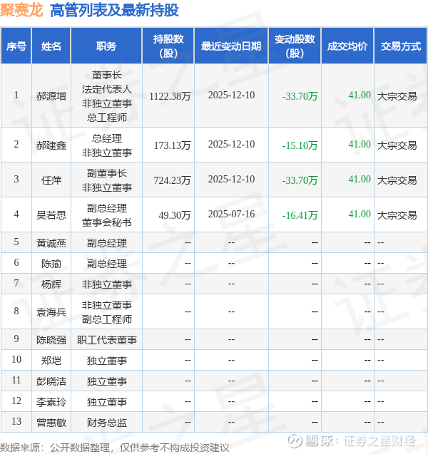 聚赛龙的高管列表及最新持股情况如下: