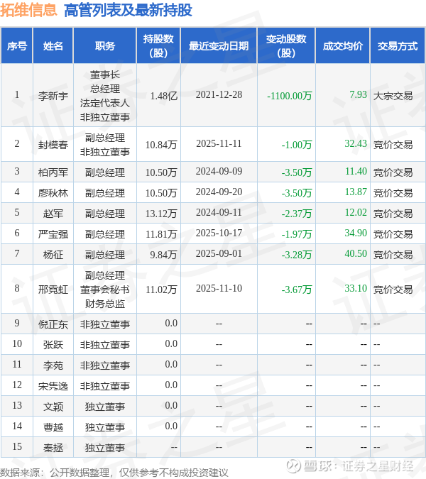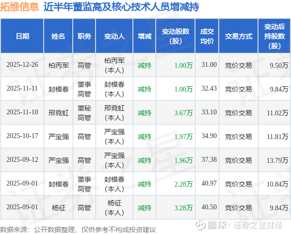 拓维信息近半年内的董监高及核心技术人员增减持详情如下: