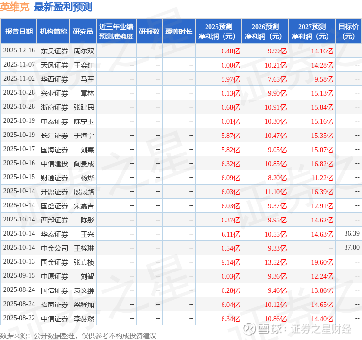 最新盈利预测明细如下: