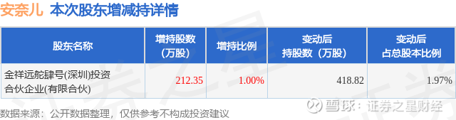 证券之星消息,12月30日安奈儿发布公告《安奈儿:关于控股股东一致行动人增持公司股份进展暨权益变动触及5%整数倍的提示性公告》,其股东金祥远舵肆号(深圳)投资合伙企业(有限合伙)于2025年12月29日合计增持212.35万股,占公司目前总股本的0.9969%,变动期间该股股价上涨3.56%,截止12月29日收盘报17.17元。