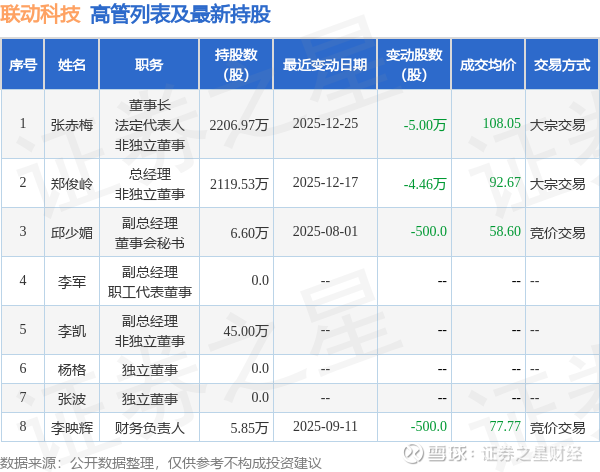 联动科技的高管列表及最新持股情况如下: