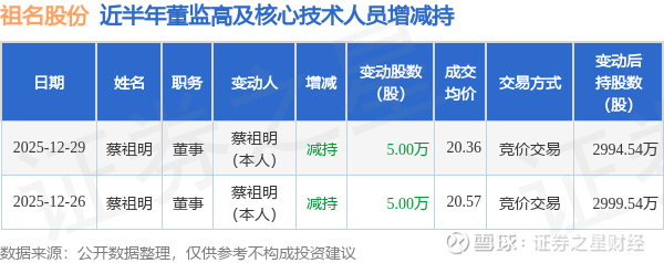 证券之星消息,根据12月30日市场公开信息、上市公司公告及交易所披露数据整理,祖名股份(003030)最新董监高及相关人员股份变动情况:2025年12月29日公司董事蔡祖明共减持公司股份5.0万股,占公司总股本为0.0401%。变动期间公司股价下跌0.1%,12月29日当日收盘报20.52元。
