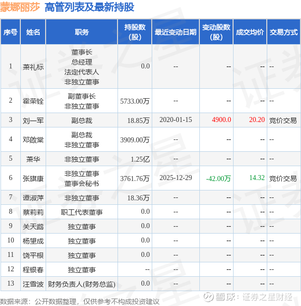蒙娜丽莎的高管列表及最新持股情况如下: