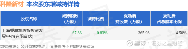 证券之星消息,12月30日科隆新材发布公告《科隆新材:持股5%以上股东权益变动达到1%的提示性公告》,其股东上海秉原旭股权投资发展中心(有限合伙)于2025年12月12日至2025年12月29日间合计减持67.36万股,占公司目前总股本的0.8284%,变动期间该股股价上涨4.67%,截止12月29日收盘报32.08元。