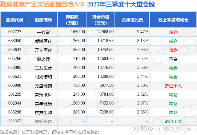 根据2025基金Q3季报公募基金重仓股数据,重仓该股的公募基金共5家,其中持有数量最多的公募基金为融通基金的融通健康产业灵活配置混合A/B。融通健康产业灵活配置混合A/B目前规模为18.16亿元,最新净值2.627(12月30日),较上一交易日下跌0.38%,近一年上涨6.27%。该公募基金现任基金经理为万民远。万民远在任的基金产品包括:融通鑫新成长混合A,管理时间为2021年10月8日至今,期间收益率为25.76%;融通价值成长混合A,管理时间为2022年7月18日至今,期间收益率为20.23%;融通医疗保健行业混合A/B,管理时间为2023年3月15日至今,期间收益率为-23.93%。