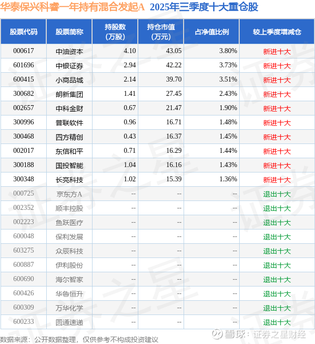 根据2025基金Q3季报公募基金重仓股数据,重仓该股的公募基金共1家,其中持有数量最多的公募基金为华泰保兴基金的华泰保兴科睿一年持有混合发起A。华泰保兴科睿一年持有混合发起A目前规模为0.11亿元,最新净值0.9738(12月30日),较上一交易日下跌0.2%,近一年下跌3.21%。该公募基金现任基金经理为周咏梅 黄俊卿。周咏梅在任的基金产品包括:华泰保兴尊颐定开,管理时间为2018年7月26日至今,期间收益率为30.95%;华泰保兴安盈定开混合,管理时间为2019年5月6日至今,期间收益率为45.34%;华泰保兴科荣混合A,管理时间为2020年5月21日至今,期间收益率为22.58%;华泰保兴久盈63个月定开债,管理时间为2020年8月24日至今,期间收益率为21.58%。黄俊卿在任的基金产品包括:华泰保兴嘉睿3个月持有债券发起A,管理时间为2025年5月8日至今,期间收益率为4.53%;