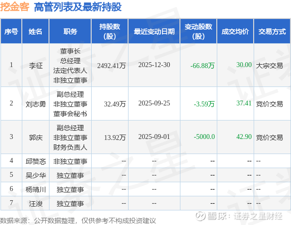 挖金客的高管列表及最新持股情况如下: