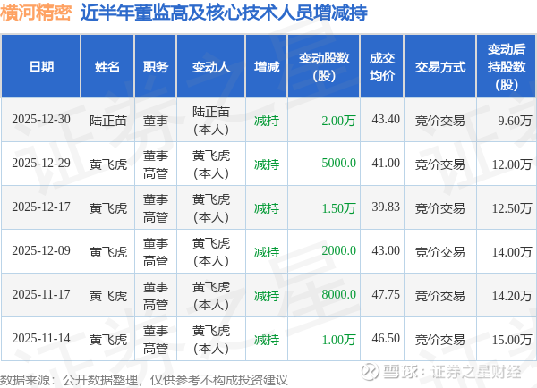 证券之星消息,根据12月31日市场公开信息、上市公司公告及交易所披露数据整理,横河精密(300539)最新董监高及相关人员股份变动情况:2025年12月30日公司董事陆正苗共减持公司股份2.0万股,占公司总股本为0.0075%。变动期间公司股价上涨6.44%,12月30日当日收盘报43.5元。