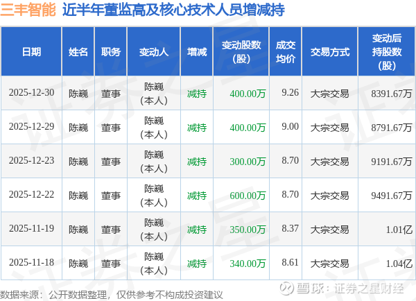 三丰智能近半年内的董监高及核心技术人员增减持详情如下: