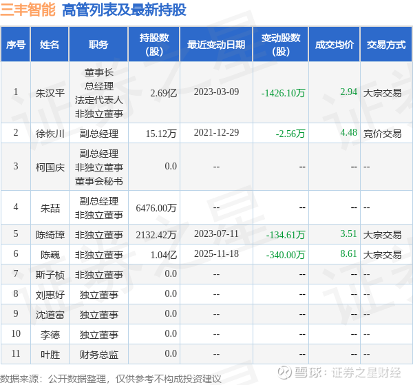 三丰智能的高管列表及最新持股情况如下: