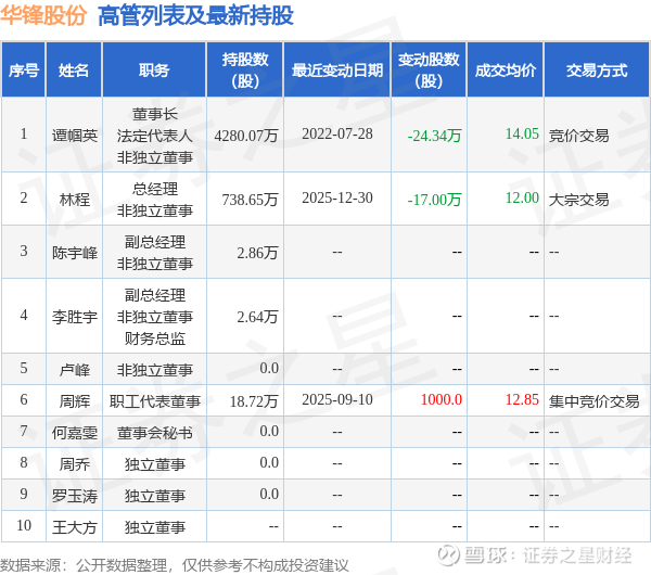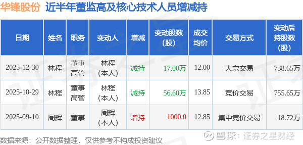 华锋股份近半年内的董监高及核心技术人员增减持详情如下: