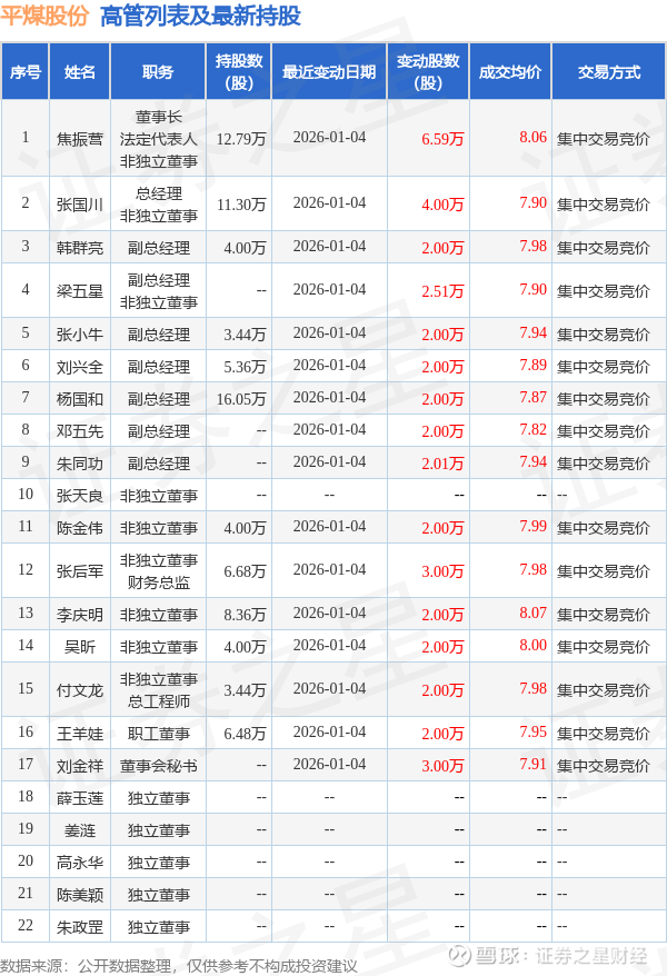 证券之星消息,根据1月4日市场公开信息、上市公司公告及交易所披露数据整理,平煤股份(601666)最新董监高及相关人员股份变动情况:2026年1月4日公司董事长焦振营、董事,总经理张国川、副总经理韩群亮、董事,副总经理梁五星、副总经理张小牛、副总经理刘兴全、副总经理杨国和、副总经理邓五先、副总经理朱同功、董事陈金伟、董事,财务总监张后军、党委书记,董事李庆明、董事吴昕、董事,总工程师付文龙、职工董事王羊娃、董事会秘书刘金祥共增持公司股份41.11万股,占公司总股本为0.0165%。变动期间公司股价上涨0.0%,12月31日当日收盘报7.87元。