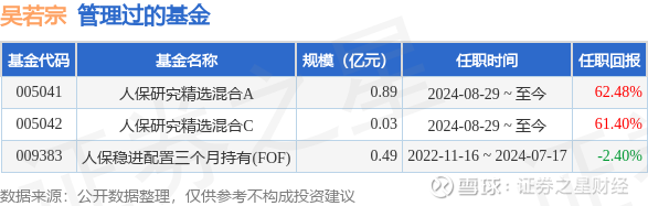 吴若宗先生:中国国籍,北京大学工程硕士。曾任鸣石投资管理有限公司量化分析师,长江证券资产管理有限公司研究员,淳厚基金管理有限公司研究员。2022年8月加入中国人保资产管理有限公司公募基金事业部,2022年11月16日至2024年7月17日任人保稳进配置三个月持有期混合型基金中基金(FOF)基金经理。2024年8月29日担任人保研究精选混合型证券投资基金基金经理。