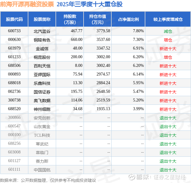 前海开源再融资股票的前十大重仓股如下: