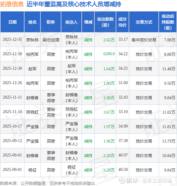 拓维信息近半年内的董监高及核心技术人员增减持详情如下: