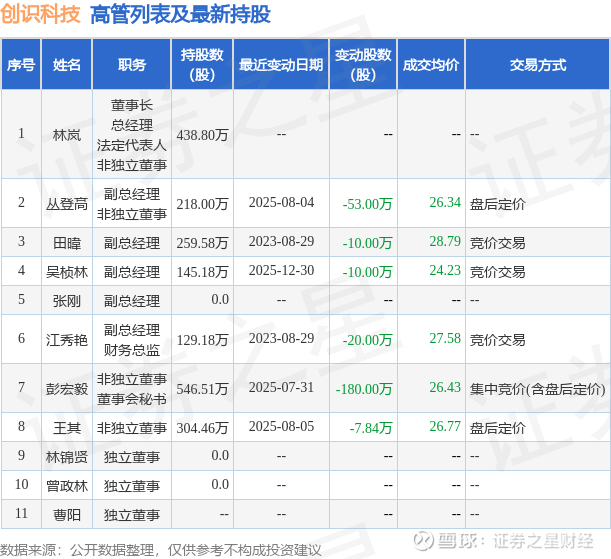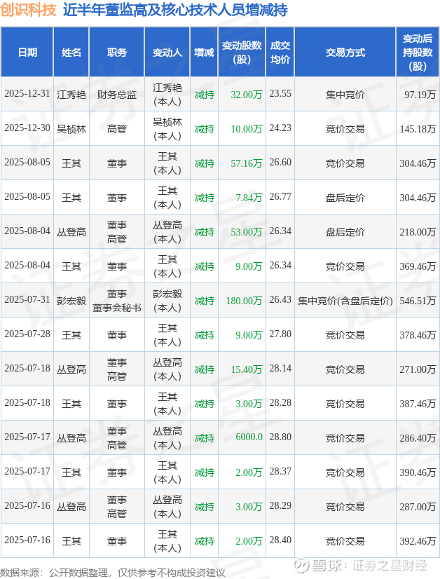 创识科技近半年内的董监高及核心技术人员增减持详情如下: